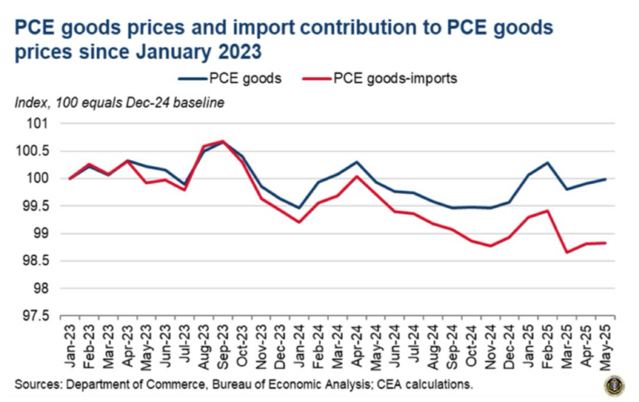 Simultaneously, we have not seen any real rise in prices for imported goods generated by the current tariff rates. In fact, the import prices on goods have declined compared to our domestic goods prices, according to the latest report by the Council of Economic Advisors (CEA).