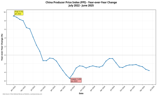 China is another fitting example, albeit for different reasons. Their producer prices are in a deflationary spiral. They drop their prices on exported goods to the United States because they need to keep manufacturing workers employed. In essence they are exporting their deflation to us.