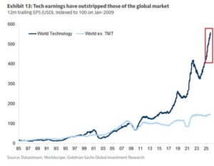 Over the long run, technology earnings have dramatically outpaced those of the broader global market. That structural advantage remains intact. What has changed is the character of that growth.