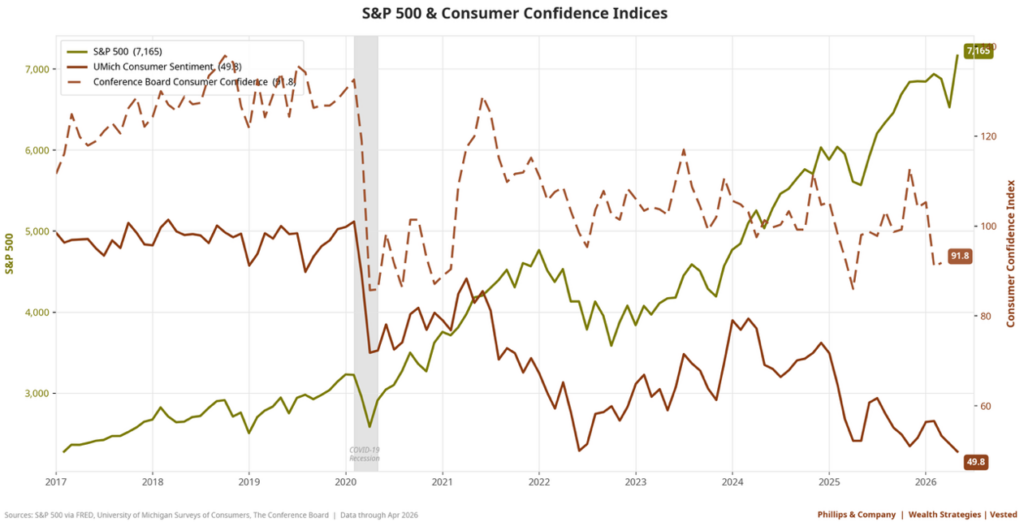 This is the paradox in one picture. Consumer sentiment is sitting near an all-time low, while the S&P 500 is at an all-time high. At first glance, that looks irrational. But it is really a reminder that feelings and behavior are not the same thing. Consumers can be frustrated by prices, worried about geopolitics, and irritated by day-to-day costs, while still showing up at restaurants, taking trips, and making purchases.