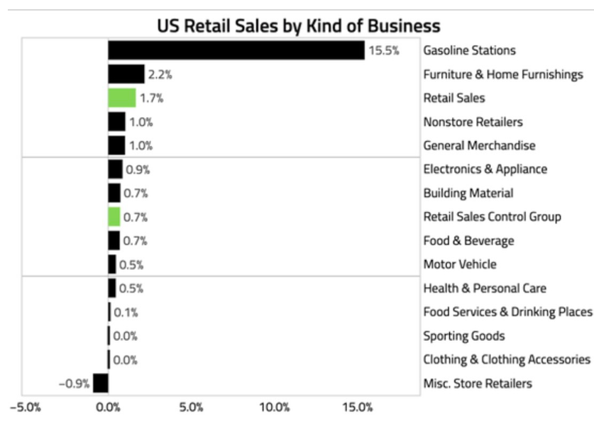 You can see part of that in the retail sales data. The consumer has still been spending, but the mix matters. Some of the recent strength came from a jump in gasoline sales and some temporary support from tax refund season. In other words, the spending data was not weak, but not all of the strength was organic either.