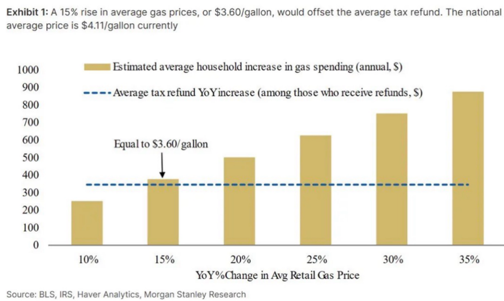 This is another good way to frame it. It does not take an extreme move in gas prices to eat into the benefit of a typical refund. If gasoline stays elevated long enough, a good part of that springtime cash-flow cushion gets absorbed at the pump.