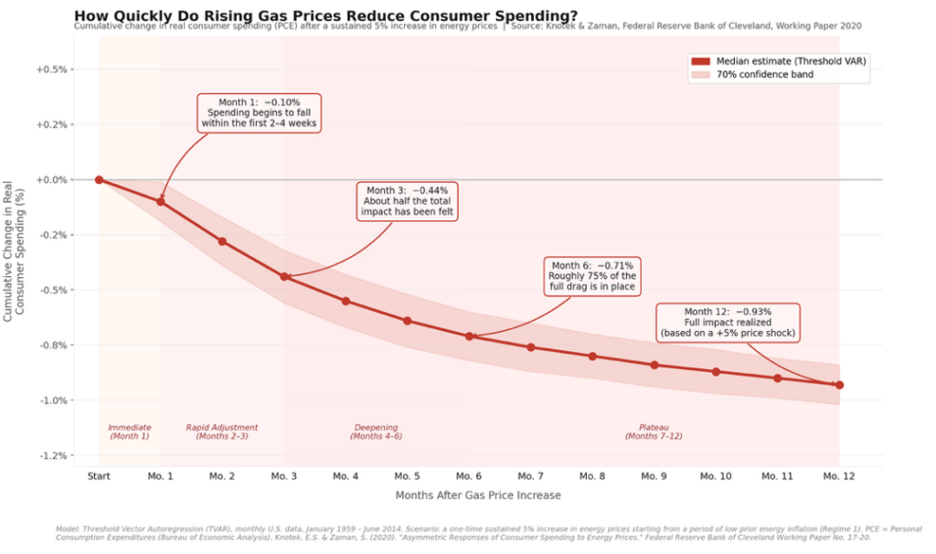 Higher gas prices do hurt spending, but they do not typically crush it all at once. The Cleveland Fed work shown here suggests the drag builds over time. The first month impact is modest. By month three, a meaningful share of the effect has shown up. By month six, much of the drag is in place. By month twelve, the full effect is felt.
