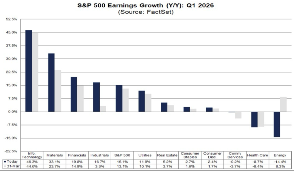 Q1 helped establish that base. Earnings expectations have risen from 13% to 15% EPS growth. Expectations and realized momentum have been strongest in areas like technology, materials, and financials, while weakness has been more sector-specific. The bigger point is that the earnings engine did not stall. It kept running.
