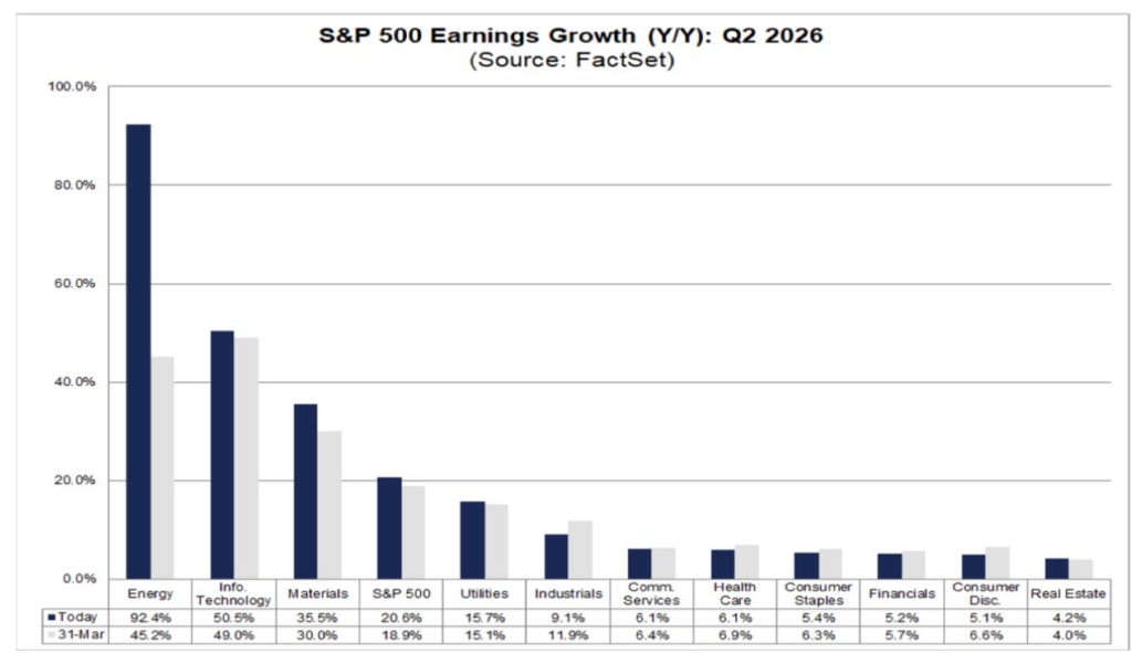 Now Q2 expectations are moving higher as well from 19% to nearly 21% EPS growth. Yes that’s right 21% EPS growth-remarkable. Analysts are not simply recognizing what already happened. They are revising forward numbers up. Energy is a large part of that, of course, but technology and materials remain strong, and the broader S&P 500 earnings picture has improved too.