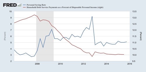 Consumers also have plenty of dry powder in their wallet to spend as well. Personal debt service as a percentage of disposable income (red) is at historic lows and savings (blue) from the gasoline windfall are still sitting in consumer’s bank accounts. [vii]