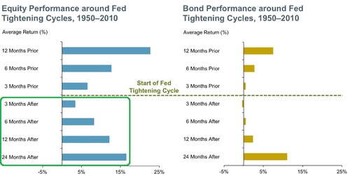 6) Investors may be moving to equities from debt as they seek shelter from rising rates. You can see from the chart below, stocks tend to perform better than bonds across the board during rising rate environments, at least during the first couple of years. While this is an average over a long period, much depends on the pace of the rate increases. [vii]