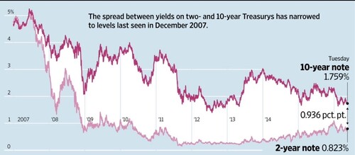 The yield curve can get a little flatter as we have discussed in prior posts and this could be a precursor to a recession. This chart from the WSJ. [x]
