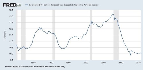 Combine this with the fact that the amount households pay to service all of this debt is still at very low levels, relative to where we were prior to the financial crisis. [vi]
