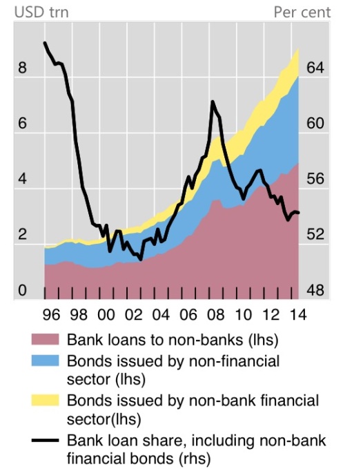 As US interest rates have been lower than emerging market interest rates for almost a decade, many companies in emerging economies have borrowed money in dollars from everyone but the banks. On the chart below you can see the debt owed to non-banks has grown by 50% and the share of bank loans (black line) has dropped from over 64% to about 52% today. [iii]