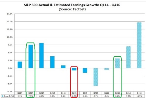 Now look at earnings expectations for 2016 and you can see on a YOY basis we return to decent EPS growth. Again from our friends at FactSet. [v]