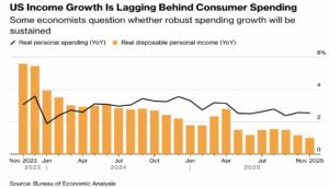 Real income growth is clearly moderating. The data shows that consumer spending has been running ahead of real disposable income growth for some time, a dynamic that is mathematically unsustainable over long periods.