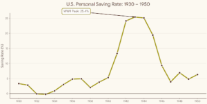 After World War II, Americans saved aggressively—not because they were pessimistic, but because rationing had taught them restraint. As shortages eased and prices stabilized, savings fell even though incomes didn’t surge overnight.