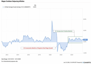 Capital spending flows outward—into construction jobs, equipment, chips, power, and logistics. Those dollars become wages. And wages become spending. Real wages are now positive again and have remained so for over two years.
