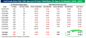 This historical table captures a rare but important setup: periods when the Fed cuts aggressively, yet long-term yields rise or fail to fall.