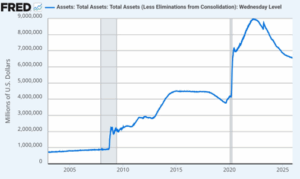While the Fed talked about “normalization,” its balance sheet never returned to anything resembling pre-crisis levels. QT reduced assets at the margin — but the structural presence of the Fed remained.