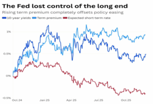 That split helps explain why long-term yields haven’t followed the Fed lower. The Fed has lost control of the long end. That’s the point.