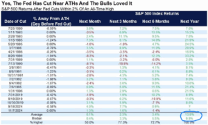 Historically, when the Fed cuts rates while markets are near all-time highs, forward equity returns have tended to be constructive, particularly over 6–12 months.