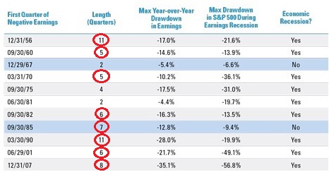 That would make five consecutive quarters in a row with negative earnings growth. The last time we saw an earnings recession this long was 2008 and 2009, which was followed by the stock market rally in March 2009.