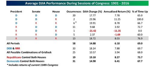 In fact, when you look at political party control and equity market returns, Republican control of both houses and the Presidency is not necessarily that bad. While not the best possible combination (from a historic return perspective), we should all be able to live with the returns. [ix]