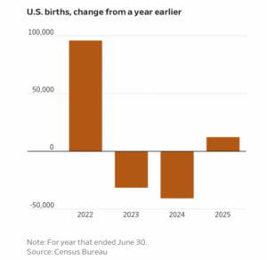 The most telling yet underreported news this week came from the US Census Bureau. After a brief post-pandemic rebound in 2022, births fell sharply in 2023 and again in 2024. The modest uptick in 2025 doesn’t change the direction of travel.