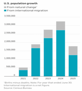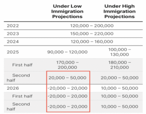 Brookings’ migration data shows that the surge in immigration during 2022–2024 has already peaked. Net immigration declined in 2025 and may approach zero or turn negative in 2026. This isn’t political ideology. It’s math.
