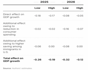 Under both low and high immigration scenarios, Brookings estimates a 0.2%–0.3% annual drag on GDP growth from slower labor force expansion, reduced consumption, and higher saving.