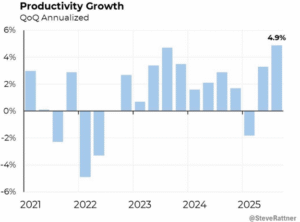 When labor growth slows, productivity is how the economy cheats the math. The recent acceleration suggests we may be learning to do more with fewer workers — easing labor shortages, supporting growth, and giving the economy more room to run than population trends alone would imply. Think AI and innovation.